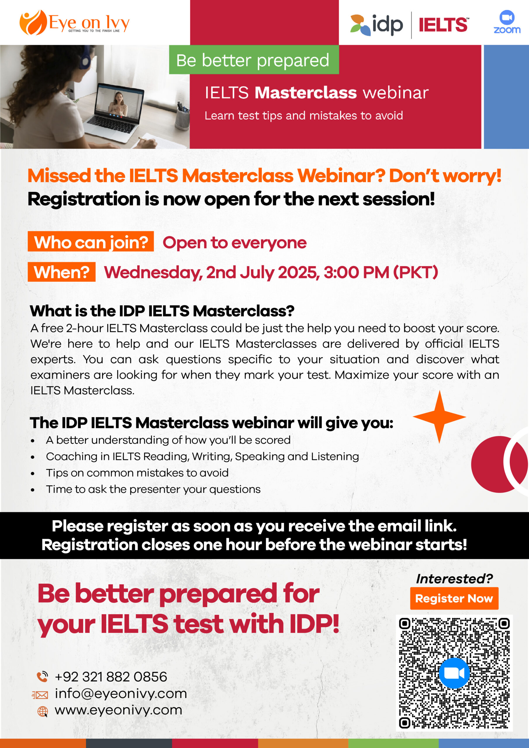 Eye on Ivy, in collaboration with IDP IELTS, invites you to a free expert-led IELTS Masterclass designed to help you prepare with purpose and perform with confidence. 📅 Date: Wednesday, July 2🕒 Time: 3:00 PM (Pakistan Time)🌐 Location: Online (Join from anywhere) This comprehensive session will walk you through all four sections of the IELTS exam: Led by official IELTS experts, the masterclass will offer:✅ Deep insights into IELTS scoring criteria✅ Common pitfalls and how to avoid them✅ Practical strategies for high performance✅ A chance to ask your questions live 🎯 Whether you’re aiming for academic, professional, or immigration success, this session will give you the tools to approach your IELTS exam with confidence. 📝 Register now: https://idp-events.zoom.us/webinar/register/WN_bt61boolR_GWgWt68G-L9A#/registration⏳ Registration closes 1 hour before the session begins. Don’t miss this opportunity to learn directly from IELTS experts!