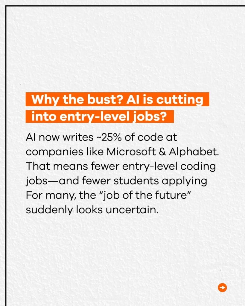 Tech giants like Microsoft and Alphabet now use AI to write nearly 25% of their code, automating many routine tasks. As a result, entry-level programming jobs are shrinking, and the role of the human coder is evolving.