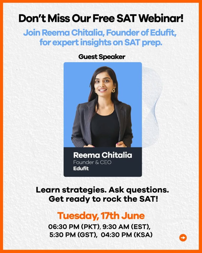 Eye on Ivy invites you to a free, power-packed webinar with Reema Chitalia, CEO of Edufit, as she shares expert SAT strategies that helped 89% of students boost their scores by 200+ points in just 8 weeks!